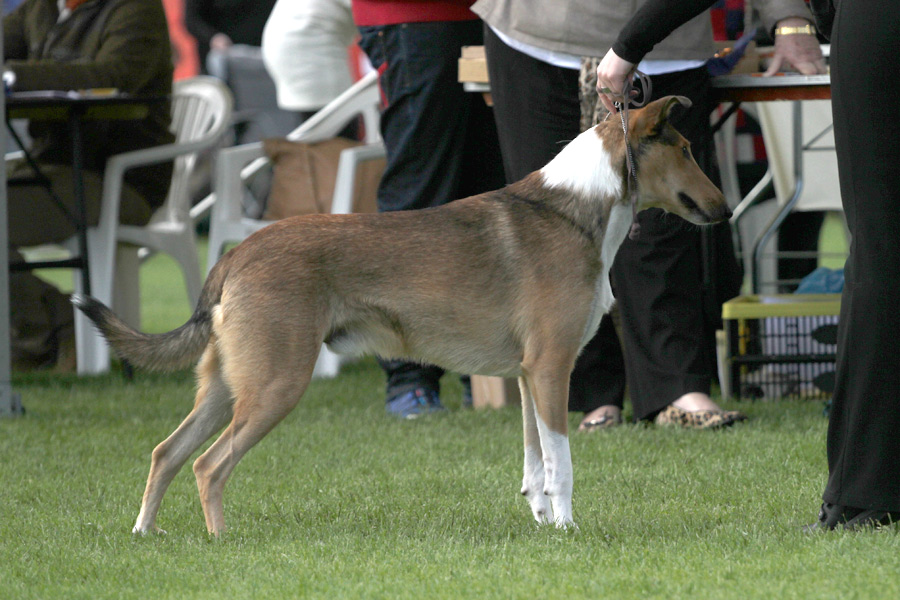 Arvostelu: ”Good for size. Good head plains. Bite not her (virtue?). Good neck. Well balanced, well muscled. Very typical. Moves correct going away and coming back, exhibits typical collie movement in going around.”