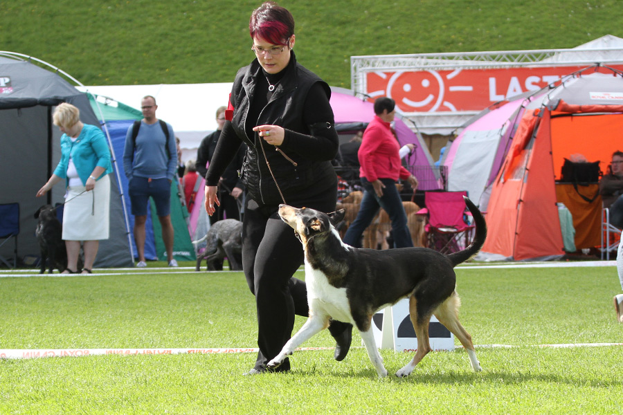 Näpsän kanssa oltiin vuorossa seuraavana ja Timo olikin valmiina koiran vaihtoon kehän reunalla. Näpsän kanssa huomasin etten muistanut yhtään lämmitellä (eli antaa sille makkaraa) ennen kehää, mutta rutiinit on kohdillaan ja sen kanssa meni jälleen hienosti esiintyen koko kehä. Jotain eroa kuitenkin aiempaan on, sillä juoksutus meni kauniisti löysässä hihnassa, eikä enää eteen kiskoen. Joko sillä alkaa ikä painaa, tai sitten on aika viedä sekin tarkistettavaksi jumien varalta. Tuomari antoi Näpsällekin erinomaisen ja SA:n! Paras narttu luokassa hävittiin valioluokan koirille, joista toiselle meni myös serti, joten tällä kertaa ei ruusuketta Näpsälle. Tulos siis paras narttu 3.