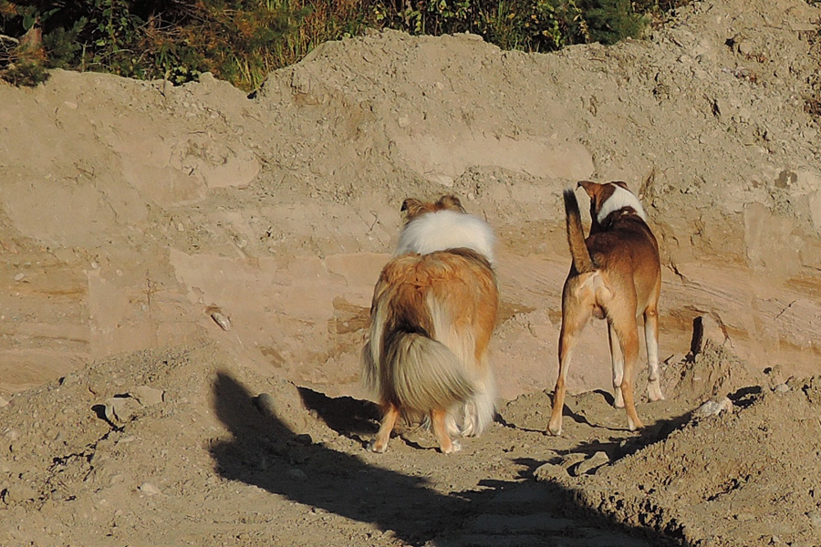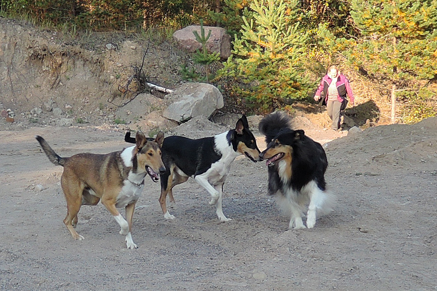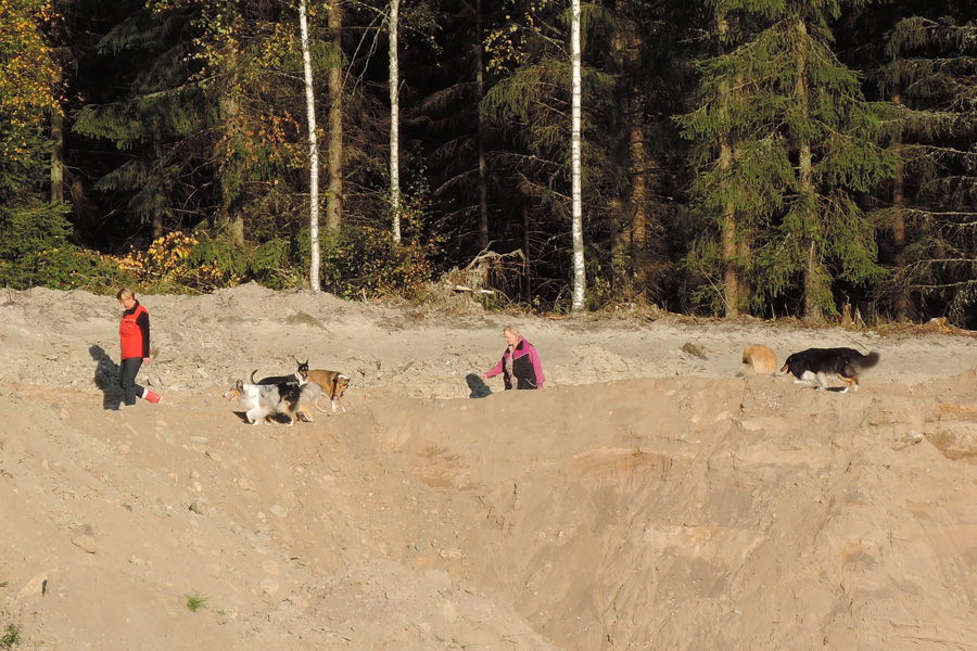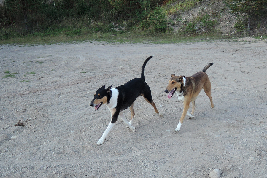 Treenailun lisäksi pääsi Tenho myös vähän sosiaalistumaan, kun jälkiporukan koirat saivat hetken aikaa rällätellä vapaana porukalla hiekkakuopalla. Tenhokin ihastui nahkacolliepoika Dingoon. Ei ne pitkätukkatytöt niin ihania sit kuitenkaan olleet kun vaihtoehto löytyi omasta karvamitasta. Sopuisasti pojat ja tyttölauma tulivat juttuun ja leikitkin olivat ihan vauhdikkaita.